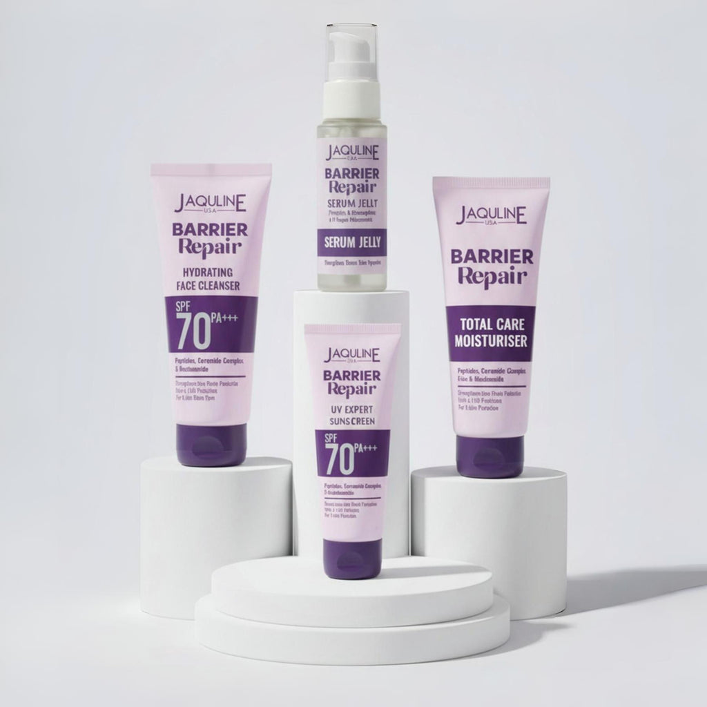 The Jaquline USA Barrier Repair Total Care Combo is a complete 4-step skincare solution designed to strengthen your skin barrier, restore hydration, and protect against external stressors. This combo includes: