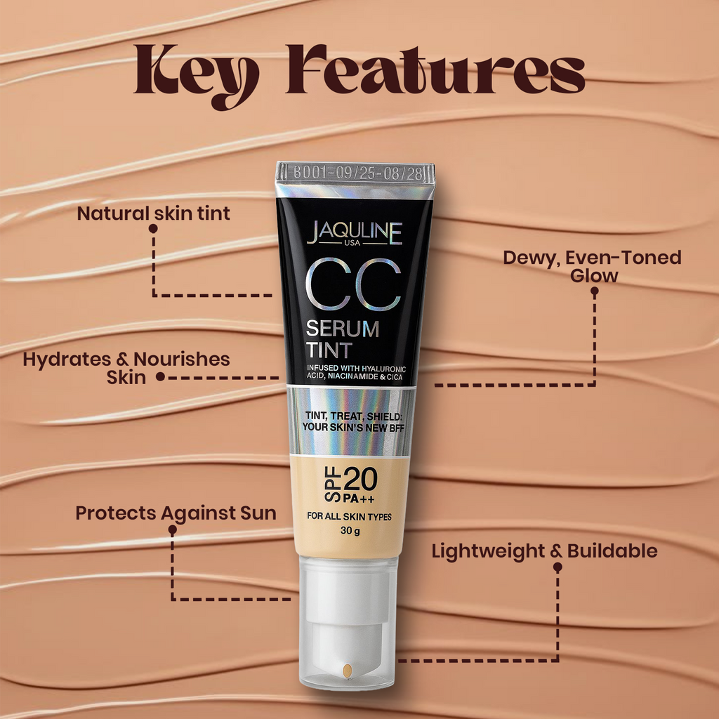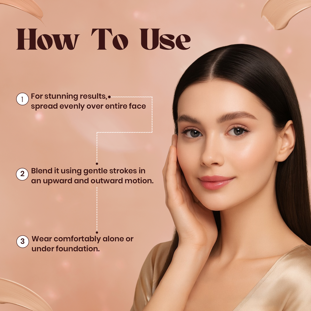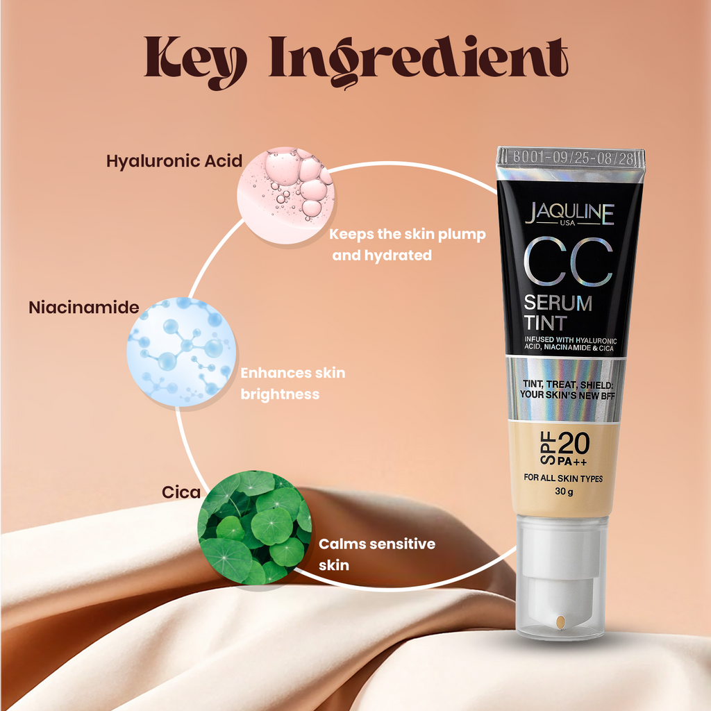 Purified Water, Titanium Dioxide, Talc, Cetostearyl Alcohol, Octyl Methoxycinnamate, Dimethicone, Glycerine, Niacinamide, Benzophenone 3, Caprylic Triglyceride, Cyclomethicone, Emulsifying Wax, Vitamin E Acetate, Amla (Emblica Officinalis) Extract, Ashwagandha (Withania Somnifera) Extract, Polysorbate 20, Hyaluronic Acid, Gotu Kola (Centella Asiatica/Cica) Extract, Tamarind (Tamarindus Indica) Extract, Magnesium Aluminum Silicate, Benzyl Alcohol, Salicylic Acid, Xanthan Gum, Potassium Sorbate, Sodium Benzoate, Iron Oxide Yellow, Iron Oxide Red.